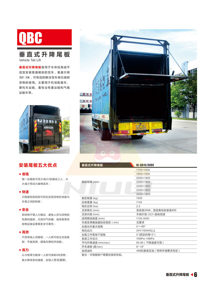 垂直式升降尾板是用于車體較高或不適宜安裝普通尾板的貨車,垂直行程為0-3米,可有效地解決貨車高位裝卸貨物的使用。主要用于集成配餐車、摩托車運(yùn)輸、畜牧業(yè)牲畜運(yùn)輸和氣瓶運(yùn)輸車等。