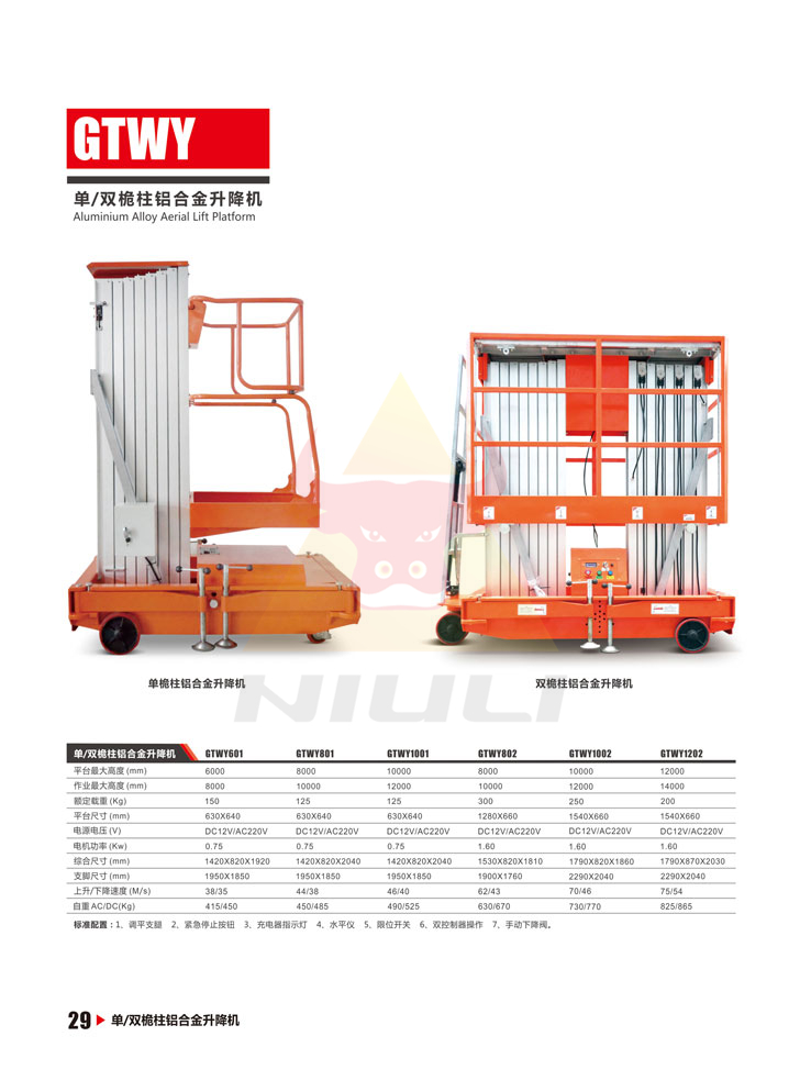 | 雙桅柱鋁合金升降機 | GTWY802 | GTWY1002 | GTWY1202 |