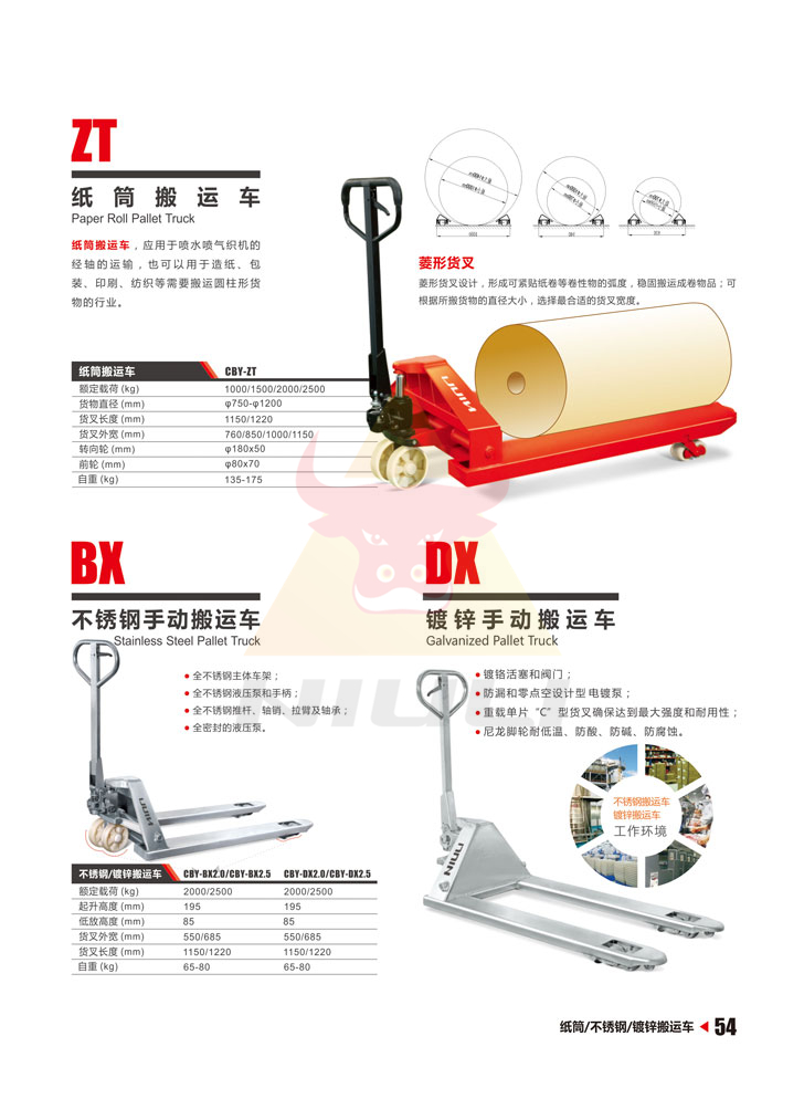 除了輪子和密封件以外所有零部件均由不銹鋼制作,如油缸、車架、手柄、推桿、軸承、插銷等;具有很強(qiáng)的抗腐蝕能力,適用于冷庫及潔凈度、抗腐蝕性要求比較高的場所,如肉類加工、奶制品加工、食品加工、 水產(chǎn)品加工等行業(yè)。